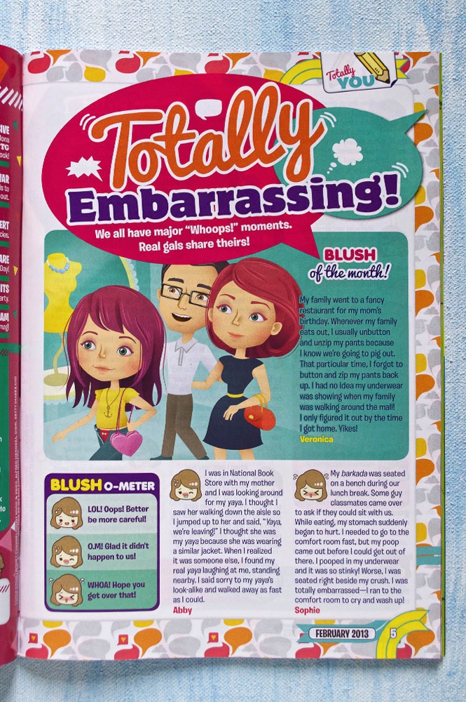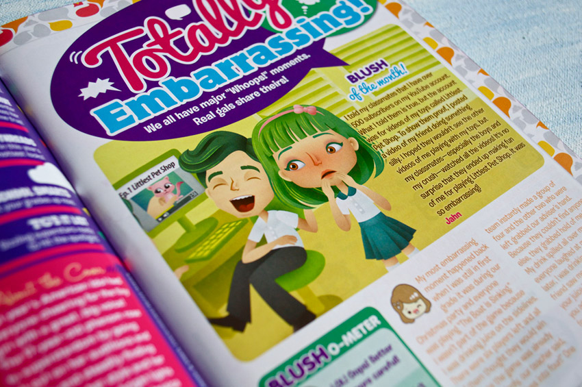 I just love playing with the characters’ expressions for the Totally Embarrassing illustrations! The difficult part of creating the characters is building up the face; and one of my favorite things when it comes to coloring is adding the details of the hair. Here’s the blush of the month story + the illustration for this month’s Total Girl Philippines.