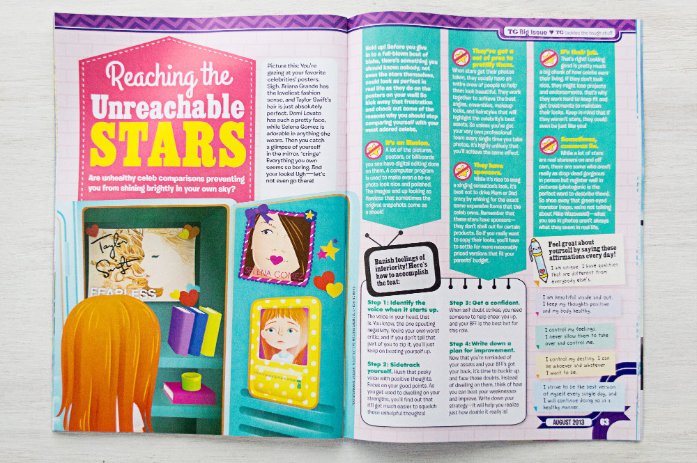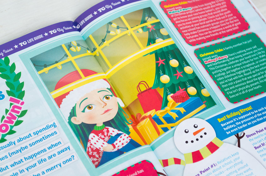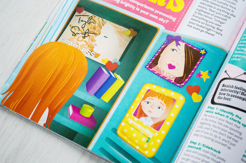 For the “Mind Matters” article, I had to illustrate a left and right brain diagram. I originally drew the girl with her brain showing, which might have grossed out the Total Girl staff (I totally understand!) haha. I had to revise it and just drew a normal head (with the top of the head intact). I still love the one with the brain showing, though! I enjoyed doing it and it took me a while to figure out how to draw the brain.