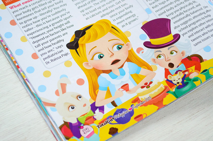 Another illustration I worked on is for the article of the “TG Life Guide” section. This is an Alice-in-Wonderland-inspired scene, showing Alice who grew so much bigger than the other characters.